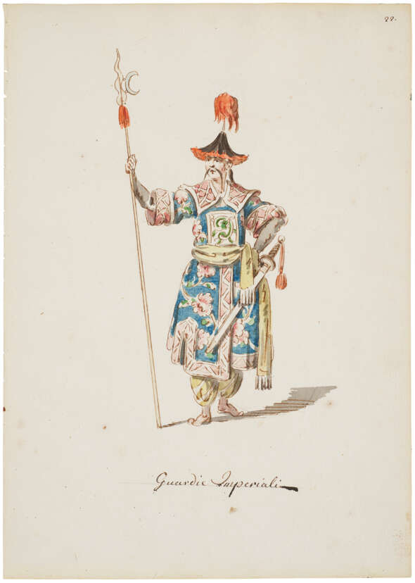 Two costume designs, Guardie Imperiali and Soldati Cinesi