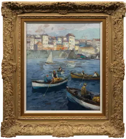 Impressionistische, mit raschem Duktus und weich-pastosem Farbauftrag gemalte Ansicht eines von zahlreichen Booten belebten Hafenbeckens auf der Insel Korfu; Im Hintergrund erhebt sich ein malerisches Fischerdorf über der hohen Hafenmauer. Die kalte, nach hinten zunehmend gedämpft angelegte Farbpalette fängt die morgendliche, noch kühle, mediterrane Stimmung eindrücklich ein. Stil- und motivtypisches Werk Sandrocks, der sich seit 1898 alljährlich an den Großen Berliner Kunstausstellungen beteiligte. Ausgebildet im Atelier von Hermann Eschke in Berlin, besaß der Künstler eine besondere Faszination für maritime Motive. Ausgehend vom Hamburger Hafen schuf er eindrucksvolle Hafen-, Meeres-, Schiffs- und Werftdarstellungen. Letztere führten den fortschritt- und technikbegeisterten Künstler schließlich auch zu seinem zweiten Hauptthema: den Industriebildern, in denen sich Sandrock u. a. Hochöfen, Stahlwerken, Zechen, Lokomotive, Turbinen und Förderbänder widmete. Beeinflusst durch Henry Enfield, Max Liebermann und die Freilichtmalerei der Schule von Barbizon, galt sein Hauptaugenmerk der Lichtwirkung, was man nicht nur seinen herausragenden Meeresimpressionen, sondern auch seiner Schilderung von glühend heißen Hochöfen, funkensprühenden Stahlwerken oder dampfenden Lokomotiven eindrucksvoll entnehmen kann. Der namhafte Kunstkritiker Max Osborn rühmte Sandrock 1912 als "eins der stärksten und hoffnungsvollsten Talente der Berliner Malerzunft" und dessen furiosen Stil. Öl/Platte. L. u. sign.; Verso eigenhändige Künstlerbez., Titel u. Berliner Atelieradresse sowie modernes Etikett mit Nachtrags-Nr. NG 117 zum Werkverzeichnis der Gemälde. 66 cm x 54 cm. Rahmen.