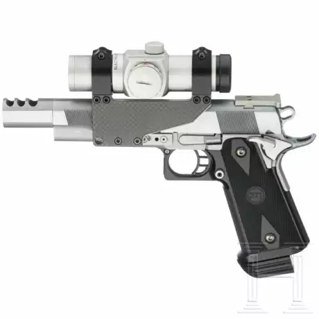 Cal. .38SuperAuto, SN. ST1381, blanker Lauf mit Kompensator. Reine Lauflänge 5". Stainless-Schlitten mit STI-Griffstück (zweireihig) kombiniert. Double-Stack-Magazin. Target-Hammer. Skelettierter Abzug. Verlängerte beidseitige Sicherung. Beavertail. Gültiger Beschuss. Seitlich montiertes Electro Dot Sight (Funktion überprüft).