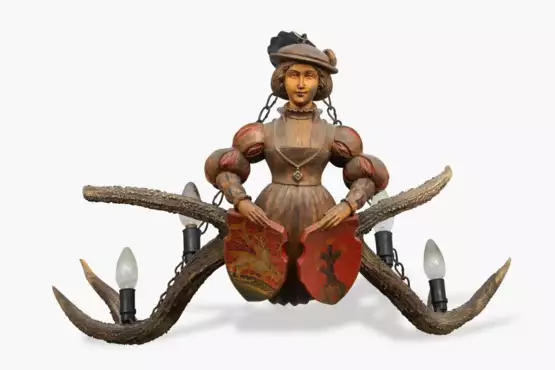 Ende 19.Jh. Holzgeschnitzte Frauenbüste in Renaissance-Tracht mit Wappenkartuschen. Hirschgeweih an Kettenaufhängung. Elektrifiziert. 80 x 87, Höhe 54 cm.