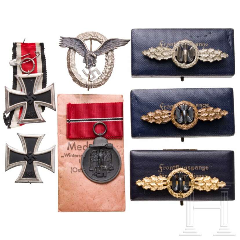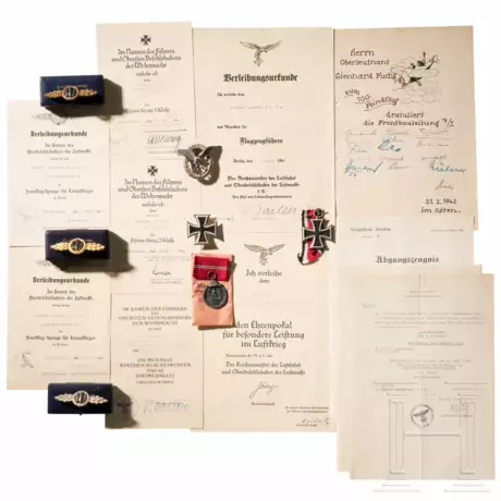 Urkunde zum Ehrenpokal der Luftwaffe, ausgestellt am 05.02.1942, Faksimilesignatur Hermann Göring, OU General der Flieger Gustav Kastner-Kirdorf. Urkunde zum Flugzeugführerabzeichen, ausgestellt am 01.07.1940, OU Generalmajor Karl Barlen. Urkunden zur Frontflugspange für Kampfflieger in Silber und Gold, ausgestellt am 08.08.1941 bzw. 05.11.1941, beide mit OU von Oberstleutnant Paul Weitkus. Urkunde zum Eisernen Kreuz 1. Klasse 1939, ausgestellt am 26.07.1941, OU GFM Albert Kesselring. Urkunde zum Eisernen Kreuz 2. Klasse 1939, ausgestellt am 16.05.1941, OU General der Flieger Bruno Loerzer. Urkunde zur Ostmedaille, verliehen am 10.07.1942, OU Major Walter Brautkuhl(?). Weitere fünf Dokumente, anbei ein Glückwunschschreiben zum 100. Feindflug. Frontflugspangen für Kampfflieger in Gold, Silber und Bronze, Buntmetallfertigungen, alle im orig. Verleihungsetui, die Goldstufe mit Hersteller "G.H. Osang", diese ungetragen, im top Zustand. Flugzeugfüherabzeichen, Buntmetallfertigung, ohne Hersteller, jedoch typische "FLL"-Fertigung. Eisernes Kreuz 1. und 2. Klasse 1939 sowie die Ostmedaille mit Verleihungstüte, Hersteller "Zimmermann". Alters- und Gebrauchsspuren.