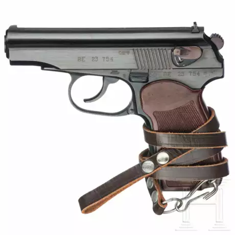 Cal. 9mmMakarov, SN. BE23754, nummerngleich. Hartverchromter Lauf. Bulgarische Fertigung. Gültiger deutscher Beschuss. Links am Schlitten und am Griffstück Seriennummer. Braune Bakelitgriffschale mit feiner Fischhaut und mit Stern. Militärholster mit Reservemagazin, Putzstock, Fangschnur. Sehr guter Erhaltungszustand.
