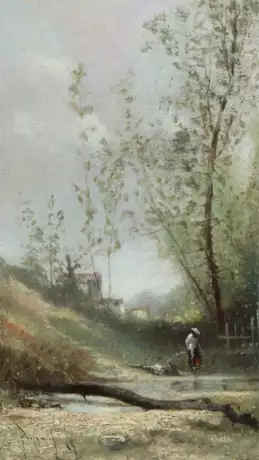 Los 1914 | Maler des 19. Jh. wohl französisch. ''Wäscherin vor dem Dorf'', lichte…