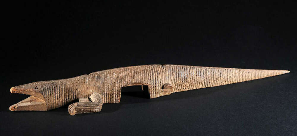 Krokodilsfigur. Lang gezogenes Krokodil mit Schuppentatauierungen. Fehlstellen. 50 cm.