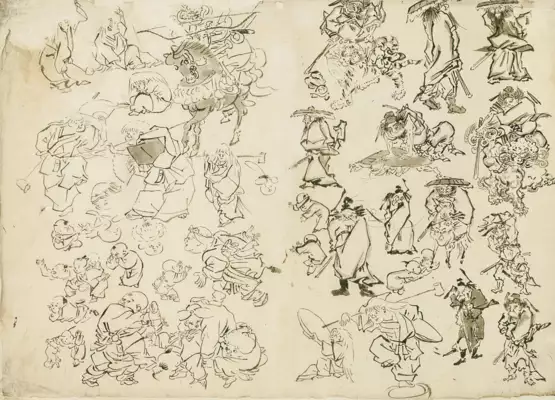 Stellenw. Randausrisse, ob. li. Eck ergänzt. - ╔Dabei: Nishikawa, Sukenobu╗ (1671-1750). Reisende halten an einer buddhistische Stele auf einem Weg an der Küste. Dplbl. aus Ehon Ikeno-kawa (Buch japanischer Geheimnisse). Blgr. 21,5 x 28 cm. - Kolorierung verblasst, fingerfl. - ╔Tachibana, Morikuni╗ (1679-1748). Schönheiten im Palast. Doppelbuchseite aus "Shahô-bukuro" (Tasche mit historischen Schätzen u. Menschen aus Japan u. China), 1720. Blgr. 21,2 x 27,5 cm. Unter Passep. mont. Seitl. etw. beschnitten. - Etw. fingerfl.