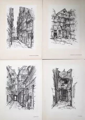 Los 208 | Mappe mit 4 Drucken"Hamburg", dabei Blick nach der Steinstraße, Hamburger Hof, Steinstraße Hof 69 und Alte Stahltreppe, jeweils unten rechts bez., jeweils 27x17 cm