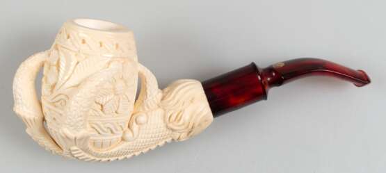 Los 697 | Meerschaumpfeife mit Bernstein-Mundstück "Altinay", unbenutzt, Pfeifenkopf in Form einer Vogelkralle, die kleines Faß hält, reich beschnitzt, L. 15 cm