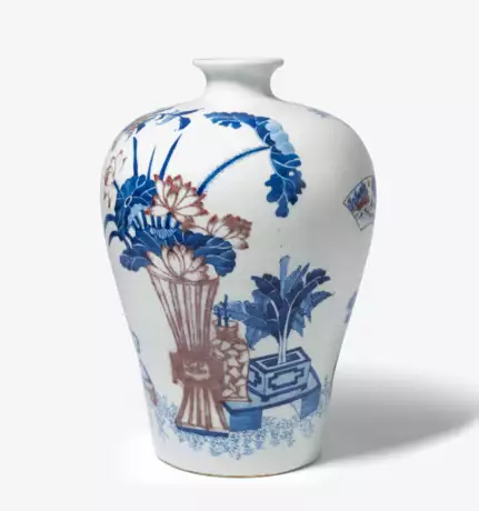 China, Qing-Dynastie. Porzellan. Dekor in Unterglasurblau und Eisenrot mit diversen Pflanzen in Töpfen, darunter Bonsai, Granatapfel, Lotus und Prunus. H 29,5 cm.