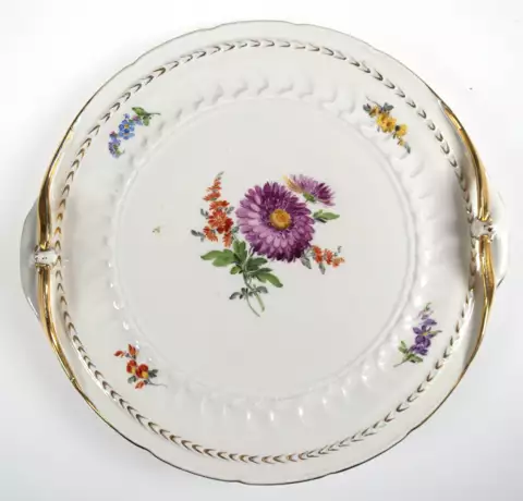 Los 402 | Meissen-Anbietplatte, Pfeifferzeit 1924-34, rund, mit plastischen Handhaben, Blumenmalerei und Golddekor z.T. berieben, Reliefdekor, Schwertermarke mit 2 Schleifstrichen, Dm. 32 cm