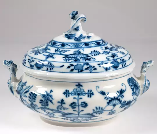 Los 411 | Meissen-Terrine, oval, Zwiebelmuster, Knaufschwerter um 1900, Deckelrand repariert, Ges.-L. 33 cm