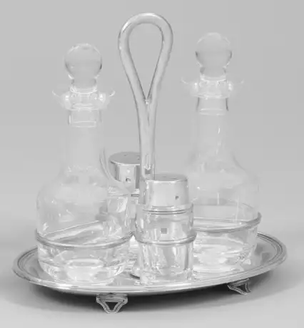 Silber. 5-tlg.; Ovaler Stand mit profiliertem Rand, mittig aufsteigender, ovaler Griff. Unterhalb vier Halteringe für Essig- und Ölflasche sowie Pfeffer- und Salzstreuer aus farblosem Glas, teilw. mit Silbermontierung. Gest. 925 bzw. 800, Herstellerzeichen. Gew. ohne Glas ca. 275 g. H. 20 cm.