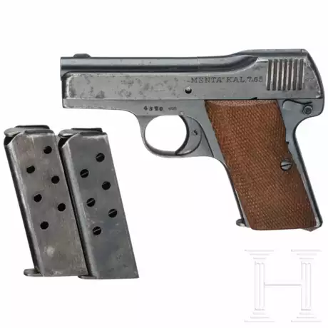 Kal. 7,65mmBrowning, Nr. 4370, nummerngleich. Rauer Lauf, Länge 73 mm. Siebenschüssig. Beschuss Krone mit "N". Rechts Auszieher. Links am Verschluss groß gemarkt "Menta Kal. 7,65". Originale Brünierung, fleckig, Tragespuren. Holzgriffschalen mit feiner Fischhaut. Magazin. Dazu zwei Ersatzmagazine.
