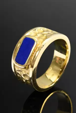 Moderner Gelbgold 750 Ring mit rechteckiger Lapislazuli Platte in partiell martellierter Ringschiene, Italien, 14g, Gr. 58
