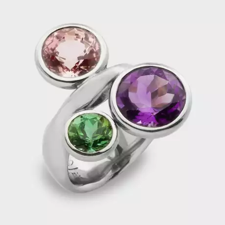 Ring set with pink, purple and green tourmalines approx. 11,50 ct., in 18 k white gold.