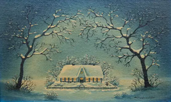 Mosbacher, Helga (geb. 1940 in Hamburg) "Haus in verschneiter Winterlandschaft", Öl/Platte, sign. u.r., 14x23,5 cm, Rahmen