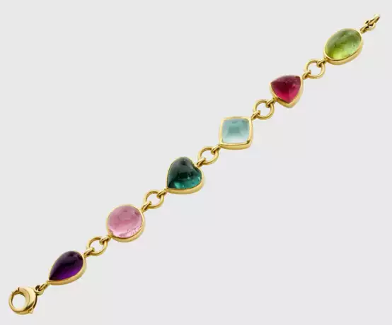 Gelbgold, 18 k. Schauseitig besetzt mit unterschiedlich farbigen Turmalin-Cabochons. Gew. ca. 40,92 g.