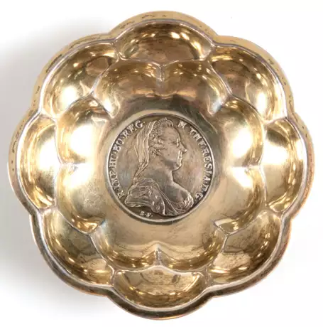 Los 698 | Münzschälchen, 800er Silber, blütenförmig geschweift, im Spiegel Maria-Theresien-Taler 1780, Ges.-Gew. 82,46 g, H. 2,8 cm, Dm. 10,5 cm