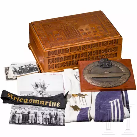 Verzierte Holzkiste, die Oberseite zeigt das Kriegsgefangenenlager sowie die Inschrift "Camp Beale Californien - 1944 - Hans Hahn", im Frontbereich die Inschrift "Zum Andenken an meine Kriegsgefangenschaft", Maße der Kiste 29 x 20 x 12 cm. 34 Fotos seiner Dienstzeit bei der Kriegsmarine, darunter schöne U-Boot-Fotos. Des Weiteren drei Fotos als Abzüge nach 1945 von Fotos aus der Kriegszeit. Außerdem Kriegsmarine-Mützenband, -Wechselkragen, U-Boot-Wandplakette (nach 1945), ein Mützenabzeichen und eine Anstecknadel der 10. U-Flottille sowie drei Miniaturen (1957er Ausführung). Alters- und Gebrauchsspuren. Gemäß U-Boot-Archiv müsste Hans Hahn auf U-515 gefahren sein; das Boot gehörte auch zur 10. U-Flottille.