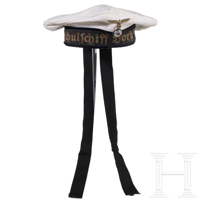 Weiße Tellermütze der Kriegsmarine, der Mützenbezug aus Waffeltuch gefertigt, wohl gereinigt oder ersetzt worden (UV-positiv), schwarzer Mützenbund mit gewebtem Mützenband "Segelschulschiff Horst Wessel", vergoldeter Metalladler über der Kokarde, innen braunes Schweißband und cremefarbenes Innenfutter, das Zelluloidtrapez ist vollständig vorhanden ohne Hersteller. Des Weiteren ein Aquarell des Segelschulschiffs mit Künstlersignatur "L. Wesemüller", datiert 1937, im "alten" Rahmen, Maße 28 x 25 cm. Anbei noch ein Bauplan der "Horst Wessel" von 1941. Dieser konnte damals für 0,75 RM gekauft werden.