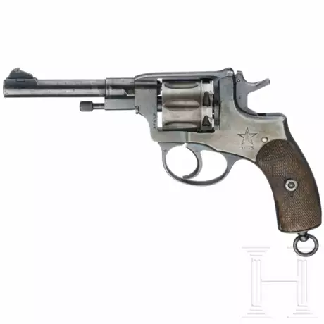 Kal. 7,62mmNagant, Nr. 17519, nummerngleich. Etwas rauer Lauf mit gutem Zug/Feld-Profil, Länge 115 mm. Siebenschüssig. Fertigung Tula 1935. Single Action für Mannschaften. Originale Brünierung noch zu ca. 50 % erhalten, Tragespuren, Holzgriffschalen. Fangring.