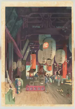 Farbholzschnitt. Betitelt Asakusa Kannon no naidô. Signiert Eishô mit rotem Siegel. Verlegermarke Watanabe. Oban-Format.