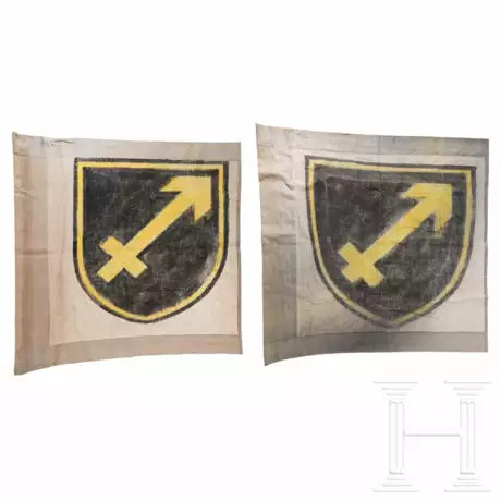 Leinen, aufschabloniertes Wappen der 23. Panzerdivision, an der linken Seite eine Schlaufe zur Befestigung einer Fahnenstange, Maße je ca. 75 x 70 cm. Alters- und Gebrauchsspuren.