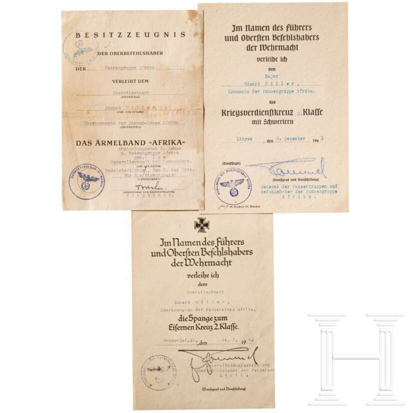 Urkunde zum KVK 2. Klasse mit Schwertern an den damaligen Major im "Kommando der Panzergruppe Afrika", datiert "Libyen, den 8. Dezember 1941" und mit eigenhändiger Unterschrift "Rommel" in blauem Kopierstift. Urkunde zur Spange zum EK 2. Klasse für den Oberstleutnant im "Oberkommando der Panzerarmee Afrika", datiert "Armee-Gef.St., den 14.7.1942" mit Stempelunterschrift Rommels. Jeweils mit Stempel "Kommando der Panzergruppe..." bzw. "... Panzerarmee Afrika". Besitzzeugnis zum Ärmelband Afrika, datiert "Rudolstadt/Thür., den 5. Mai 1944" mit OU eines Hauptmanns für den "Abwicklungstab 6. Armee u. Heeresgruppe Afrika", Stempel "Abwicklungstab 6. Armee". Jeweils DIN A5, nur die letzte Urkunde gefaltet und fleckig.