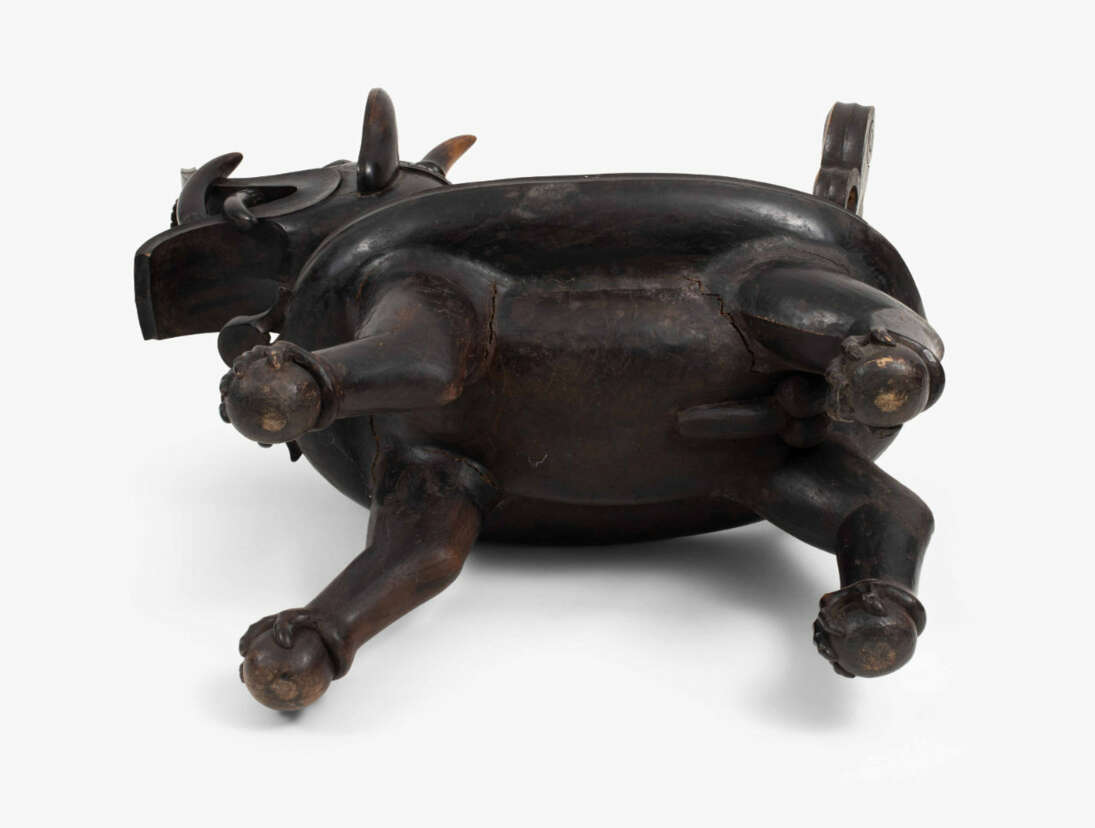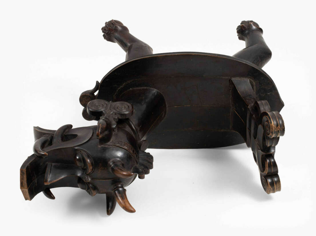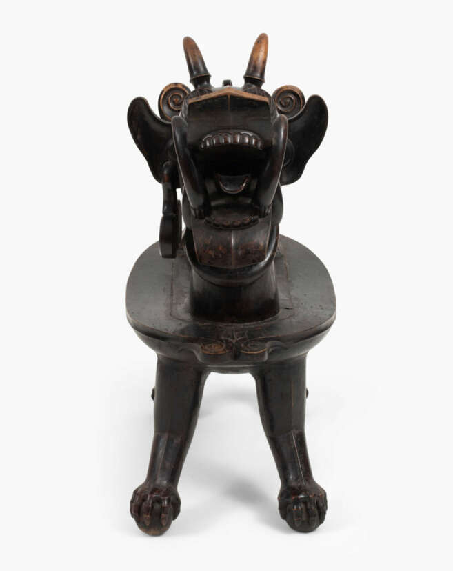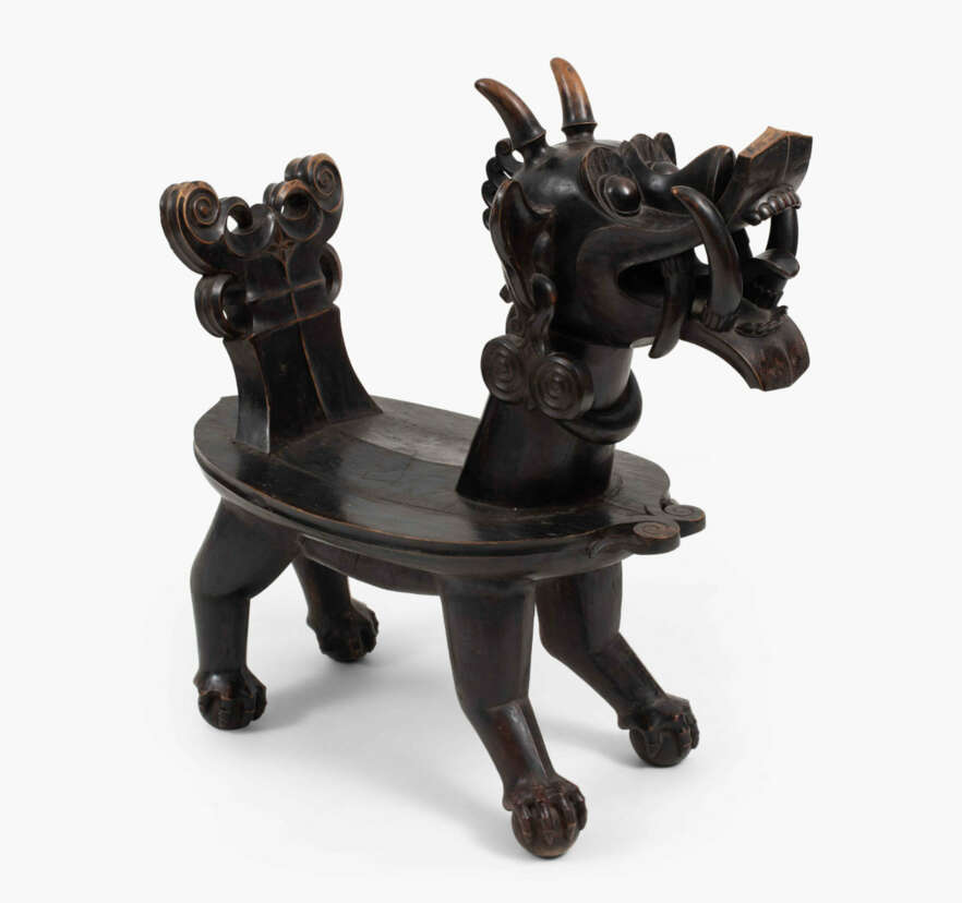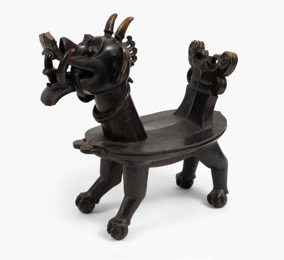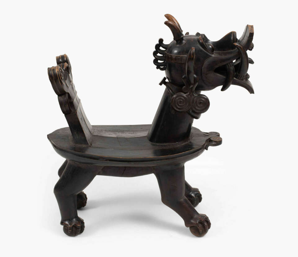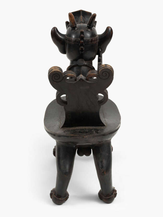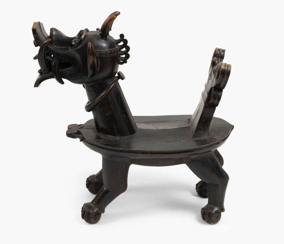 Indonesien, Nias Insel, 19./20.Jh. Holz. Geschnitzter Stuhl in der Form eines drachenartigen Fabeltiers, welches auf vier Bällen steht. Ovale Sitzfläche. 74x41,5x115,5 cm.