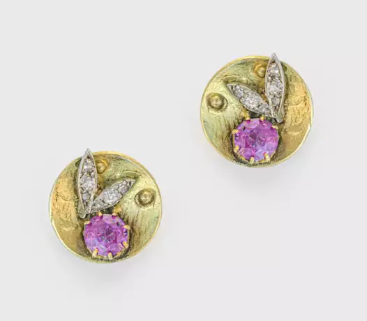 Gelbgold, gest. 750 und 585. Schauseitig besetzt mit zwei taubenblutroten Rubinen von zus. ca. 1,00 ct. und Diamantrosen. Schöne Goldschmiedeausführung. Ges.-Gew. ca. 5,94 g.