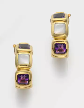 Pair of earclips by Van Cleef & Arpels, set with amethysts and mother of pearl, 18 k gold. Manufacturer's mark.