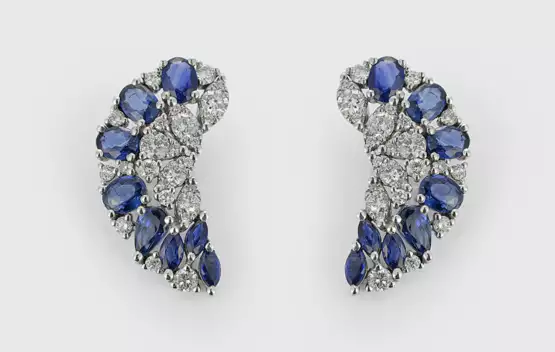 Weißgold, gest. 750. Fächerartig besetzt mit royalblauen Saphiren von zus. ca. 3,00 ct. im Ovalschliff und Brillanten von zus. ca. 1,00 ct. (G-H/vs-si). Ges.-Gew. ca. 5,88 g.