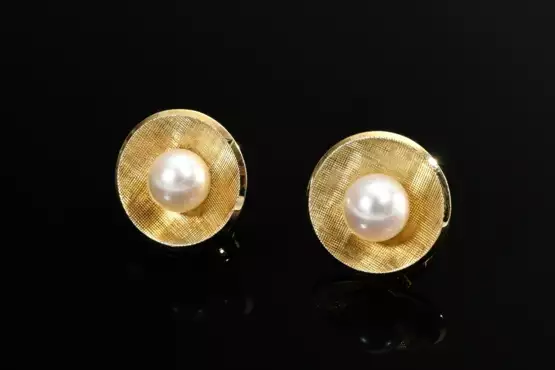 Paar Gelbgold 585 Ohrstecker mit Zuchtperlen auf gewölbter, strukturierter Scheibe, 3,5g, Ø 1,2cm