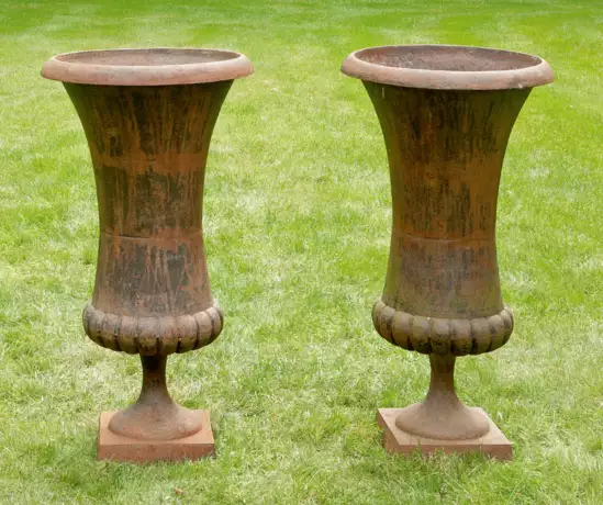 Gusseisen. Über quadratischer Plinthe kurzer Schaft als Träger für teilw. godronierten, kelchförmigen Korpus mit schmalem Lippenrand. H. 100 cm.