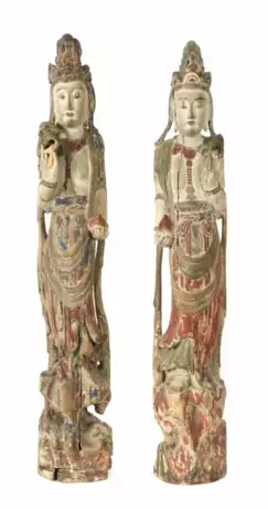 Los 2554 | Paar große Guanyin-Figuren China, 19./20. Jh., Holz, geschnitzt, farbi…
