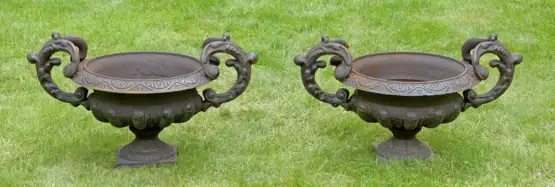 Gusseisen mit Rostpatina. Über quadratischer Plinthe gedrückter, umlaufend godronierter Korpus mit breitem, weit vorkragendem, reliefiertem Lippenrand. Stark geschwungene Henkel aus üppigen Blattvoluten. H. 48 cm.