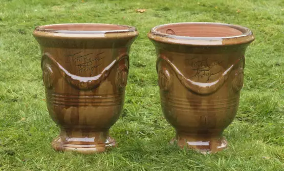 Terrakotta, braun und partiell grün glasiert. Über profilierter Basis sich weitender, kelchförmiger Korpus mit breitem, leicht vorkragendem Lippenrand, umlaufend der Wandung erhaben reliefierte, stilisierte Festons. Unten geöffnet. H. 48 cm.