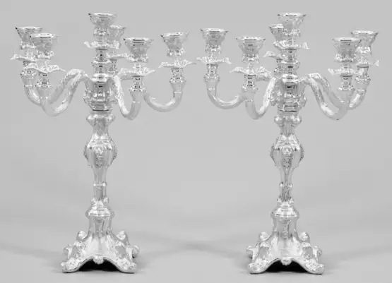 A pair of German six-light weighted silver Baroque style girandoles. Standard mark 925.