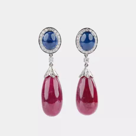 Los 130 | Paar Rubin Saphir Ohrhänger mit Brillanten.