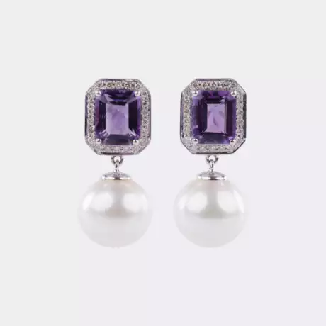 Los 283 | Paar Südseeperlen Ohrhänger mit Amethyst-Brillant Besatz.