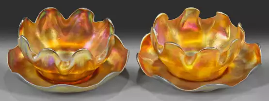jeweils mit Unterteller. Auf rundem Stand sich vorwölbende Wandung und blütenförmig gewellte Mündung, entsprechend leicht passig gewellter Unterteller. Favrile-Glas, bernsteinfarben, stark gold- und bronzefarben matt irisiert. Schalen und Teller sign. L. C. T.. Schalen mit Ritz-Nummer 4918. Rundes Firmenetikett "Tiffany Favrile Glass - Registered Trade Mark". Ges.-H. 6,5 cm. Ges.-D. 11,5 cm.