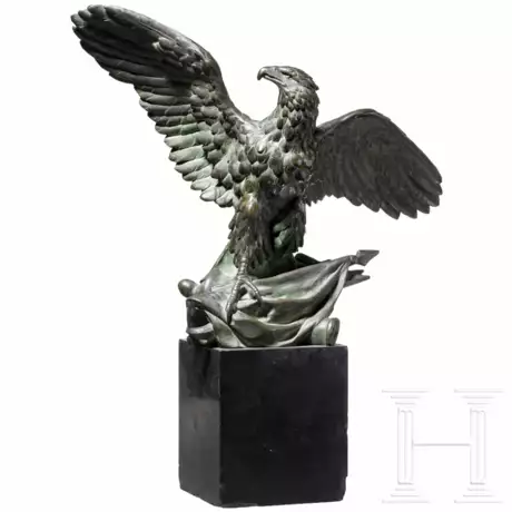 Bronze mit dunkelgrüner Edelpatina. Äußerst eindrucksvoller Adler mit ausgebreiteten Schwingen auf Kanonenrohr, Fahnen und Schwert. Der Verschluss des Kanonenrohres mit Künstlersignatur "P. Bouvier" und Gießermarke "Colin Paris". Auf dunklem Granitsockel, die Kanten bestoßen, teils mit Ausbrüchen. Höhe der Skulptur 24,5 cm, Gesamthöhe 35 cm.