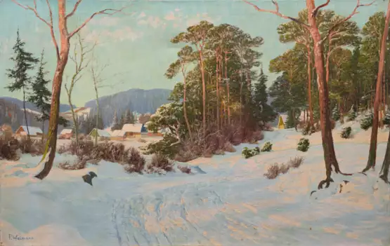 Verschneite Riesengebirgslandschaft mit Dorfansicht in klarer, zugleich stimmungsvoller Beleuchtung durch die Strahlen der tief stehenden Wintersonne. Weimann studierte ab 1888 bei Carl Ernst Morgenstern an der Kunstakademie in Breslau und 1897-1899 bei Eugen Bracht in Berlin Landschaftsmalerei. In seiner Kunst gilt er als Meister der Winterlandschaft, deren Motive er meist in seiner Heimat im Riesengebirge fand. Das Riesengebirgsmuseum in Hirschbach besitzt eine Reihe seiner Arbeiten. Öl/Lwd.; L. u. sign.; 80 cm x 120 cm.