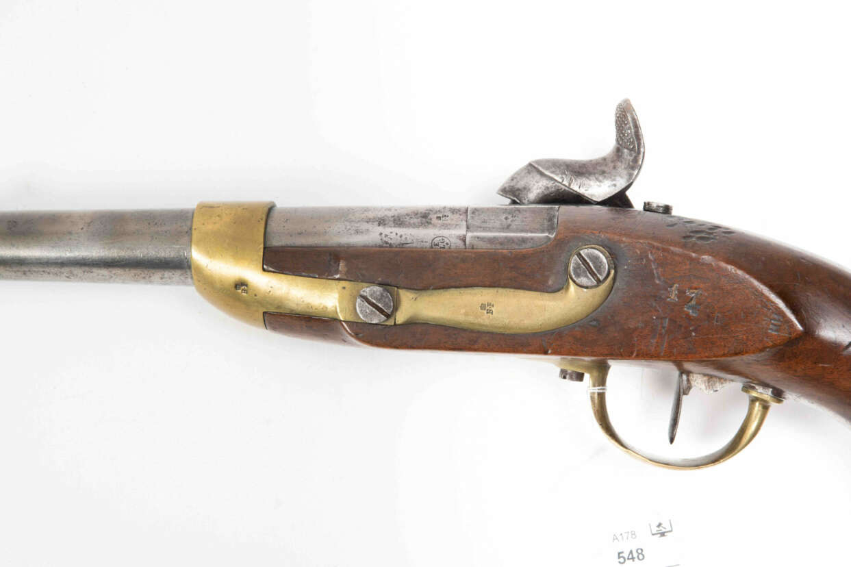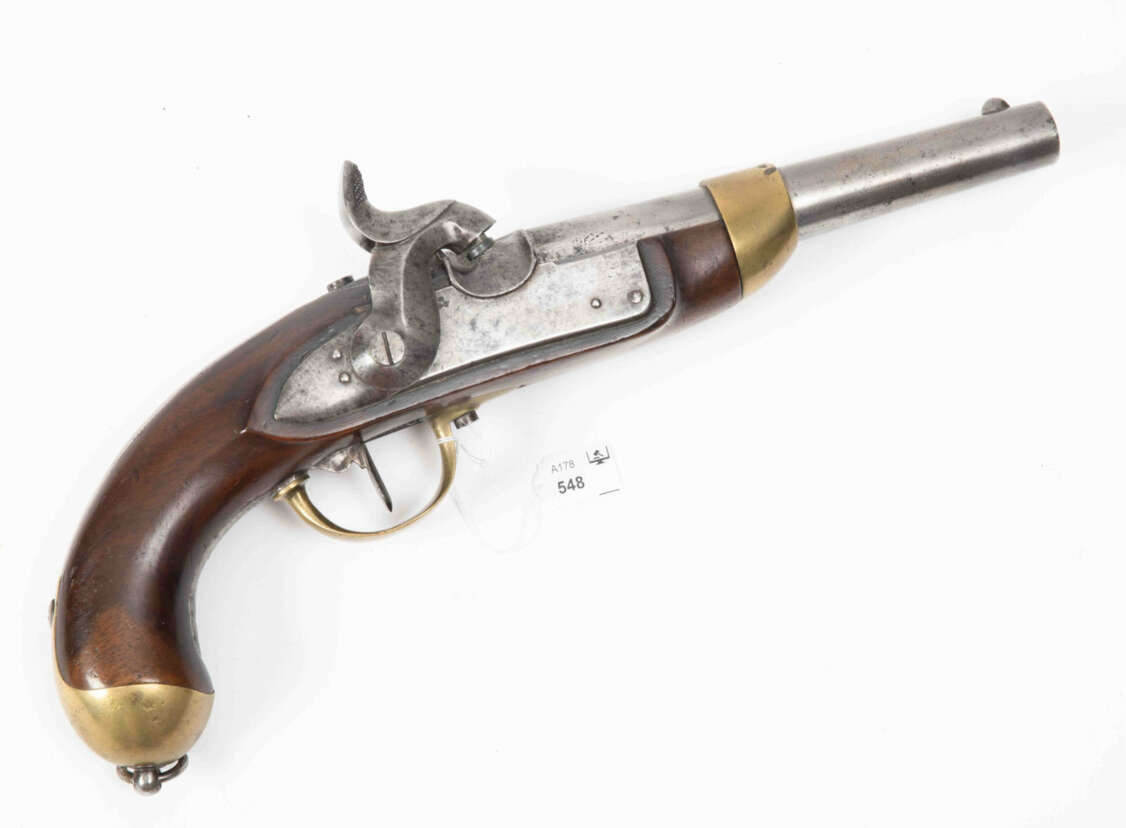 Eidg. Ord. 1842, Zürich, Kavallerie. Rundlauf (L 21 cm), Kal. 17,5 mm, mit Korn, Kammerbereich oktogonal. Laufoberseite mit Waffennr. 286 und Zürcher Zeughausschlag; Lièger und Abnahmestempel "BF". Schlossplatte flach. Schlossgang einwandfrei. Messinggarnitur mit Abnahmestempeln "BF". Nussbaumschaft etwas bestossen, mit Brandstempel "17". L 37 cm.