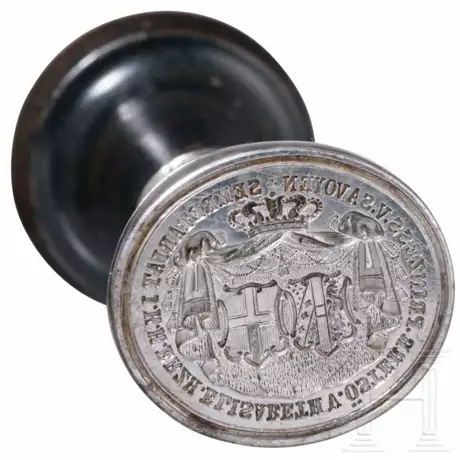 Ovale Matrix aus Eisen mit tief geschnittener Gravur. Das zentrale Motiv zeigt die zwei von einem hermelinbesetzten Mantel umgebenen Wappen des herzoglichen Paares, bekrönt von einem Erzherzoghut. Die umlaufende, fein geschlagene Inschrift lautet: "SEKRETARIAT I.K.H. ERZH. ELISABETH V. ÖSTERR. PRINZESS. V. SAVOYEN". Pilzförmiger Griff aus ebonisiertem Holz mit leichten Kratzern und einer facettierten, stellenweise fleckigen Eisenfassung. Maße der Matrix 3,7 x 3,3 cm, Höhe 12 cm.
