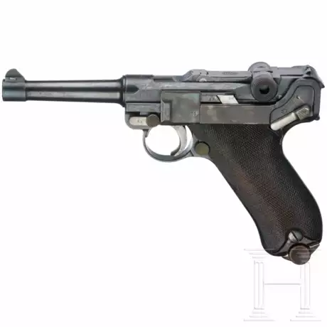 Cal. 9mmLuger, SN. 1685b, nummerngleich inkl. Schlagbolzen. Leicht rauer Lauf, Länge 100 mm. Achtschüssig. Kaiserlicher Beschuss. Ohne Nut für Anschlagschaft. Div. kais. Abnahmen. Unten am Lauf Härteprüfzeichen "Bö 24". Auf dem Hülsenkopf bezeichnet "1913", am Vordergelenk "DWM". Originale Brünierung mit Tragespuren, stellenweise patiniert, fleckig. Nummerngleiche dunkle Nussholzgriffschalen. Nummerngleiches Falzmagazin mit Holzboden.