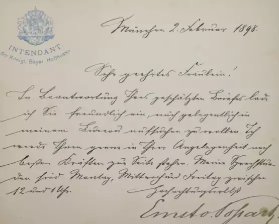 Auf einem Kart. mit gedrucktem Kopf: Intendant der Königl. Bayer. Hoftheater, mit Wappen. An ein ungenanntes Fräulein: "In Beantwortung Ihres geschätzten Briefes lade ich Sie freundlich ein, mich gelegentlich in meinem Bureau aufsuchen zu wollen... Meine Sprechstunden sind Montag, Mittwoch und Freitag zwischen 12 und 1 Uhr". - Tinte der letzten 2 Buchstaben des Namens etw. verlaufen.