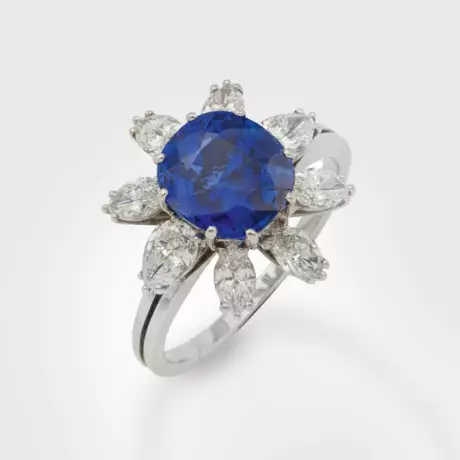 Weißgold, gest. 750. Zentral besetzt mit einem royal blauen Sri Lanka-Saphir von ca. 5,23 ct. im Cushioncut, entouriert von Diamant-Tropfen, bzw. -Navetten von zus. ca. 1,20 ct. (G-H/vvs-vs). Gew. ca. 7,30 g.