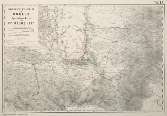 Großformatige Karten u. Tafeln zur umfangreichen Dokumentation zu den Feldzügen des Prinz Eugen von Savoyen. - Vorhanden: 1. Serie 2-9 in 8 und 2. Serie 10-17 in 7. - Nicht eingeh. kollat. Bei der Lieferung 12/2. Serie fehlt die 4. Karte. - Alle etwas wellig. - Gekauft wie besichtigt.