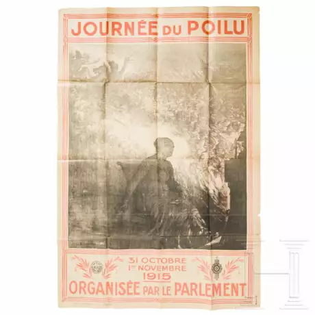Aus der Reihe "Journée du Poilu" (Tag des Frontsoldaten), schwarz-weiße Darstellung im Zentrum, rote Schrift und Rahmen, datiert 31. Oktober bis 1. November 1915, Maße ca. 80x119 cm, Alters- und Gebrauchsspuren, gefaltet. Aus dem Nachlass von Dr. Karl d`Ester.
