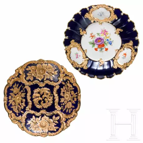 Porzellan. Der Teller im Spiegel mit polychromer Blumenmalerei und die Fahne mit goldgerahmter, reliefierter Rocaillen- und Blütenzier. Unterseite mit Schwertermarke mit zwei Schleifstrichen. Durchmesser 30 cm. Die Schale mit stark ansteigender Fahne mit kobaltblauem Fond und goldenen Rocaillenkartuschen. Unterseite mit Schwertermarke (1. Wahl), gepresster Marke "796" sowie "158". Durchmesser 31 cm.